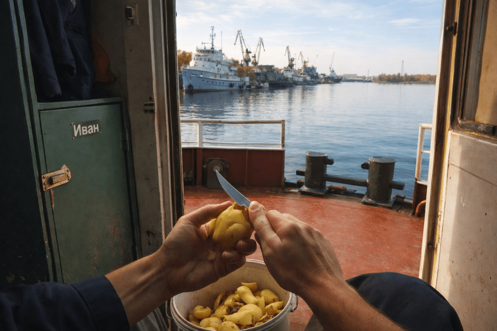 Он взял нож. Картошку. И начал чистить. Так началась его первая вахта. Первый день прошёл спокойно. Слишком спокойно.